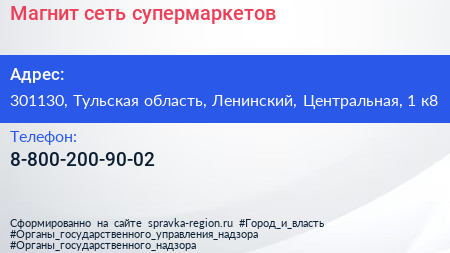 Магнит, сеть супермаркетов по адресу 301130, Тульская область, Ленинский, Центральная, 1 к8 в дальнейшем Организация, размещена в следующих категориях:
