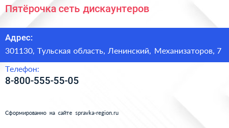 Пятёрочка, сеть дискаунтеров по адресу 301130, Тульская область, Ленинский, Механизаторов, 7 в дальнейшем Организация, размещена в следующих категориях: