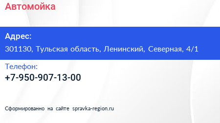 Автомойка по адресу 301130, Тульская область, Ленинский, Северная, 4/1 в дальнейшем Организация, размещена в следующих категориях: