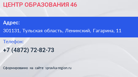 ЦЕНТР ОБРАЗОВАНИЯ № 46 по адресу 301131, Тульская область, Ленинский, Гагарина, 11 в дальнейшем Организация, размещена в следующих категориях: