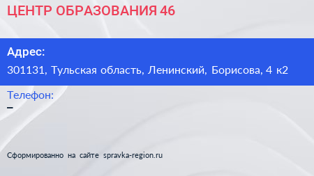 ЦЕНТР ОБРАЗОВАНИЯ № 46 по адресу 301131, Тульская область, Ленинский, Борисова, 4 к2 в дальнейшем Организация, размещена в следующих категориях: