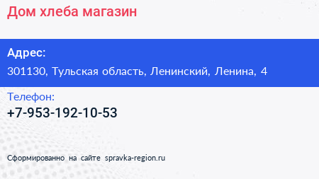 Дом хлеба, магазин по адресу 301130, Тульская область, Ленинский, Ленина, 4 в дальнейшем Организация, размещена в следующих категориях: