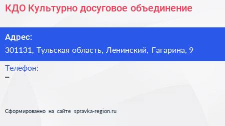КДО, Культурно-досуговое объединение по адресу 301131, Тульская область, Ленинский, Гагарина, 9 в дальнейшем Организация, размещена в следующих категориях: