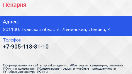 Пекарня по адресу 301130, Тульская область, Ленинский, Ленина, 4 в дальнейшем Организация, размещена в следующих категориях: