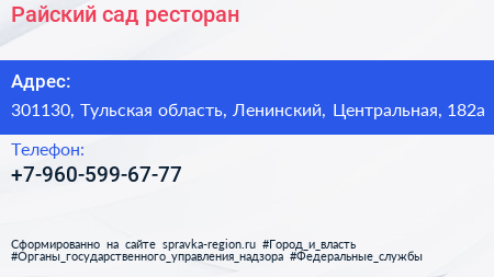 Райский сад, ресторан по адресу 301130, Тульская область, Ленинский, Центральная, 182а в дальнейшем Организация, размещена в следующих категориях: