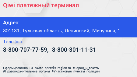 Qiwi, платежный терминал по адресу 301131, Тульская область, Ленинский, Мичурина, 1 в дальнейшем Организация, размещена в следующих категориях: