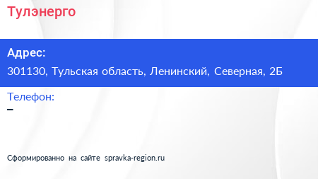 Тулэнерго по адресу 301130, Тульская область, Ленинский, Северная, 2Б в дальнейшем Организация, размещена в следующих категориях: