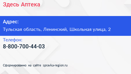 Здесь Аптека по адресу Тульская область, Ленинский, Школьная улица, 2 в дальнейшем Организация, размещена в следующих категориях: