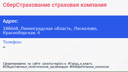 СберСтрахование, страховая компания по адресу 188668, Ленинградская область, Лесколово, Красноборская, 4 в дальнейшем Организация, размещена в следующих категориях: