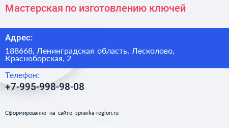 Мастерская по изготовлению ключей по адресу 188668, Ленинградская область, Лесколово, Красноборская, 2 в дальнейшем Организация, размещена в следующих категориях: