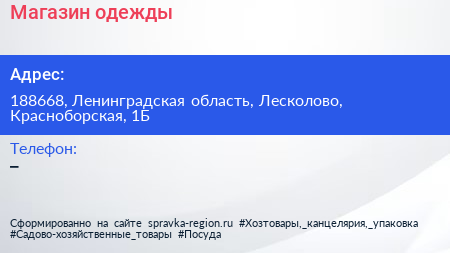 Магазин одежды по адресу 188668, Ленинградская область, Лесколово, Красноборская, 1Б в дальнейшем Организация, размещена в следующих категориях: