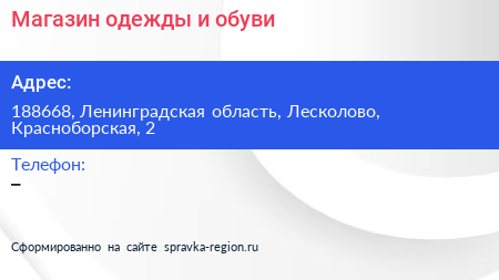 Магазин одежды и обуви по адресу 188668, Ленинградская область, Лесколово, Красноборская, 2 в дальнейшем Организация, размещена в следующих категориях: