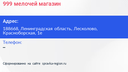 999 мелочей, магазин по адресу 188668, Ленинградская область, Лесколово, Красноборская, 1е в дальнейшем Организация, размещена в следующих категориях: