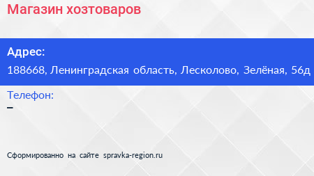 Магазин хозтоваров по адресу 188668, Ленинградская область, Лесколово, Зелёная, 56д в дальнейшем Организация, размещена в следующих категориях: