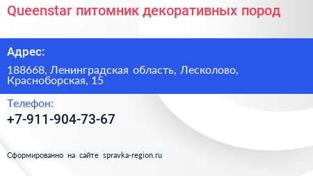 Queenstar, питомник декоративных пород по адресу 188668, Ленинградская область, Лесколово, Красноборская, 15 в дальнейшем Организация, размещена в следующих категориях: