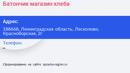 Батончик, магазин хлеба по адресу 188668, Ленинградская область, Лесколово, Красноборская, 2г в дальнейшем Организация, размещена в следующих категориях: