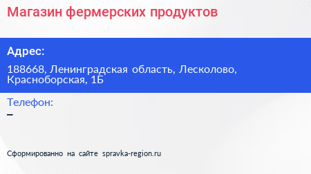 Магазин фермерских продуктов по адресу 188668, Ленинградская область, Лесколово, Красноборская, 1Б в дальнейшем Организация, размещена в следующих категориях: