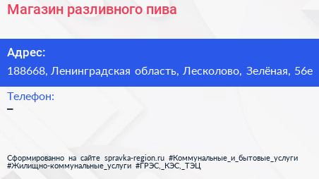Магазин разливного пива по адресу 188668, Ленинградская область, Лесколово, Зелёная, 56е в дальнейшем Организация, размещена в следующих категориях: