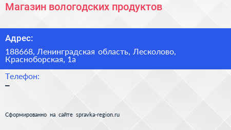Магазин вологодских продуктов по адресу 188668, Ленинградская область, Лесколово, Красноборская, 1а в дальнейшем Организация, размещена в следующих категориях: