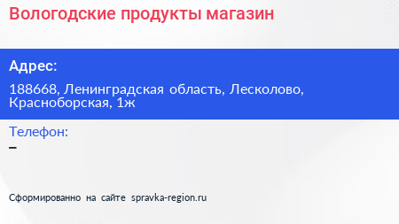 Вологодские продукты, магазин по адресу 188668, Ленинградская область, Лесколово, Красноборская, 1ж в дальнейшем Организация, размещена в следующих категориях: