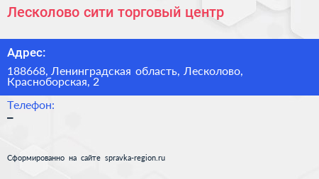 Лесколово-сити, торговый центр по адресу 188668, Ленинградская область, Лесколово, Красноборская, 2 в дальнейшем Организация, размещена в следующих категориях: