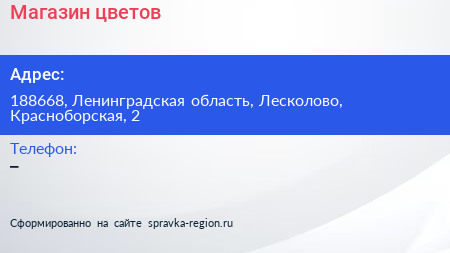 Магазин цветов по адресу 188668, Ленинградская область, Лесколово, Красноборская, 2 в дальнейшем Организация, размещена в следующих категориях: