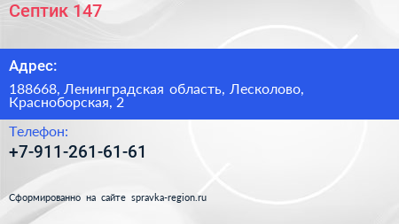 Септик 147 по адресу 188668, Ленинградская область, Лесколово, Красноборская, 2 в дальнейшем Организация, размещена в следующих категориях: