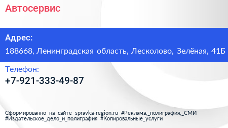 Автосервис по адресу 188668, Ленинградская область, Лесколово, Зелёная, 41Б в дальнейшем Организация, размещена в следующих категориях: