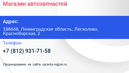 Магазин автозапчастей по адресу 188668, Ленинградская область, Лесколово, Красноборская, 2 в дальнейшем Организация, размещена в следующих категориях: