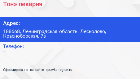 Тонэ, пекарня по адресу 188668, Ленинградская область, Лесколово, Красноборская, 7в в дальнейшем Организация, размещена в следующих категориях: