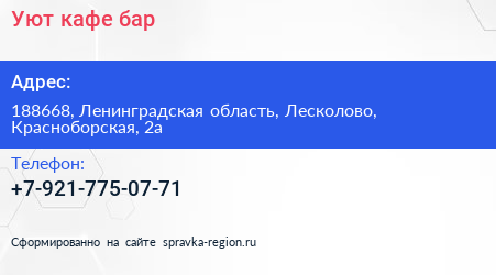 Уют, кафе-бар по адресу 188668, Ленинградская область, Лесколово, Красноборская, 2а в дальнейшем Организация, размещена в следующих категориях: