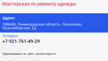 Мастерская по ремонту одежды по адресу 188668, Ленинградская область, Лесколово, Красноборская, 1д в дальнейшем Организация, размещена в следующих категориях: