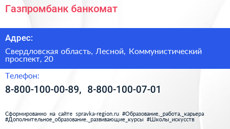 Газпромбанк, банкомат по адресу Свердловская область, Лесной, Коммунистический проспект, 20 в дальнейшем Организация, размещена в следующих категориях: