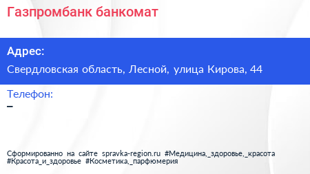 Газпромбанк, банкомат по адресу Свердловская область, Лесной, улица Кирова, 44 в дальнейшем Организация, размещена в следующих категориях: