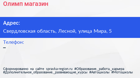 Олимп, магазин по адресу Свердловская область, Лесной, улица Мира, 5 в дальнейшем Организация, размещена в следующих категориях: