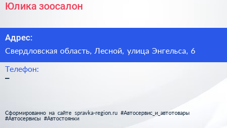 Юлика, зоосалон по адресу Свердловская область, Лесной, улица Энгельса, 6 в дальнейшем Организация, размещена в следующих категориях: