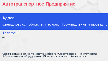 Автотранспортное Предприятие по адресу Свердловская область, Лесной, Промышленный проезд, 3 в дальнейшем Организация, размещена в следующих категориях: