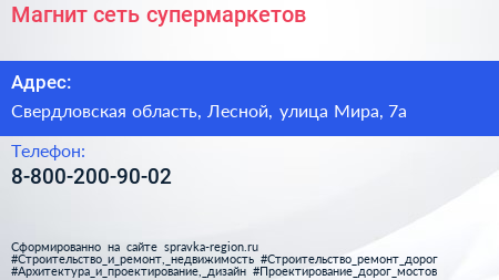 Магнит, сеть супермаркетов по адресу Свердловская область, Лесной, улица Мира, 7а в дальнейшем Организация, размещена в следующих категориях: