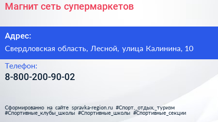 Магнит, сеть супермаркетов по адресу Свердловская область, Лесной, улица Калинина, 10 в дальнейшем Организация, размещена в следующих категориях: