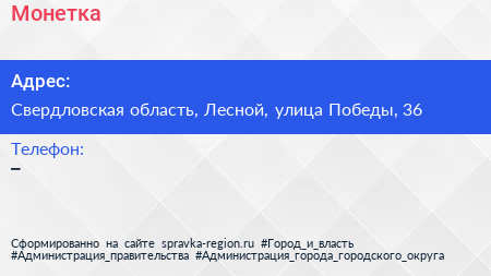 Монетка по адресу Свердловская область, Лесной, улица Победы, 36 в дальнейшем Организация, размещена в следующих категориях: