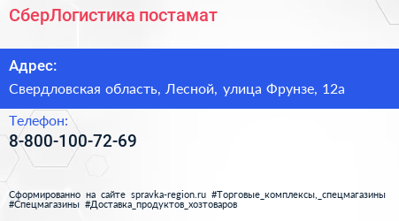 СберЛогистика, постамат по адресу Свердловская область, Лесной, улица Фрунзе, 12а в дальнейшем Организация, размещена в следующих категориях: