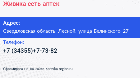 Живика, сеть аптек по адресу Свердловская область, Лесной, улица Белинского, 27 в дальнейшем Организация, размещена в следующих категориях:
