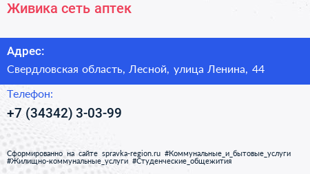 Живика, сеть аптек по адресу Свердловская область, Лесной, улица Ленина, 44 в дальнейшем Организация, размещена в следующих категориях: