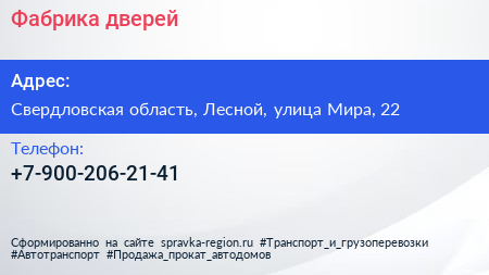 Фабрика дверей по адресу Свердловская область, Лесной, улица Мира, 22 в дальнейшем Организация, размещена в следующих категориях: