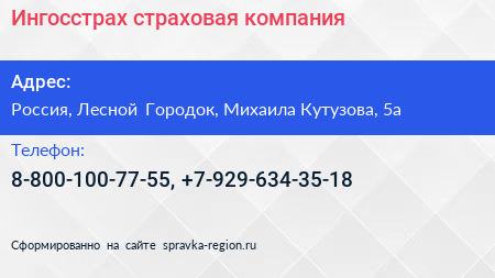 Ингосстрах, страховая компания по адресу Промсвязьбанк, 5А, улица Михаила Кутузова, Жилой комплекс «Гусарская баллада», ВНИИССОК, Одинцовский городской округ, Московская область, Центральный федеральный округ, 143072, Россия в дальнейшем Организация, размещена в следующих категориях: