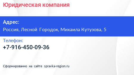 Юридическая компания по адресу 5, улица Михаила Кутузова, Жилой комплекс «Гусарская баллада», ВНИИССОК, Одинцовский городской округ, Московская область, Центральный федеральный округ, 143072, Россия в дальнейшем Организация, размещена в следующих категориях: