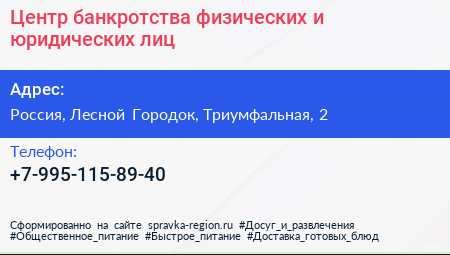 Центр банкротства физических и юридических лиц по адресу 2, Триумфальная улица, Жилой комплекс «Гусарская баллада», Одинцово, Одинцовский городской округ, Московская область, Центральный федеральный округ, 143000, Россия в дальнейшем Организация, размещена в следующих категориях:
