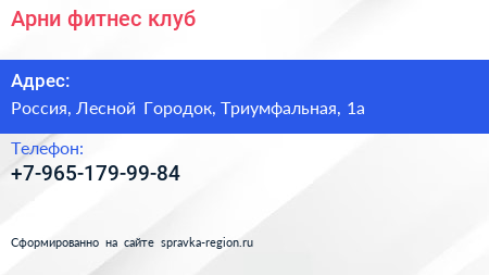 Арни, фитнес-клуб по адресу 1А, Триумфальная улица, Жилой комплекс «Гусарская баллада», Одинцово, Одинцовский городской округ, Московская область, Центральный федеральный округ, 143002, Россия в дальнейшем Организация, размещена в следующих категориях: