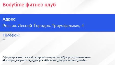 Bodytime, фитнес-клуб по адресу 4, Триумфальная улица, Жилой комплекс «Гусарская баллада», Одинцово, Одинцовский городской округ, Московская область, Центральный федеральный округ, 143000, Россия в дальнейшем Организация, размещена в следующих категориях: