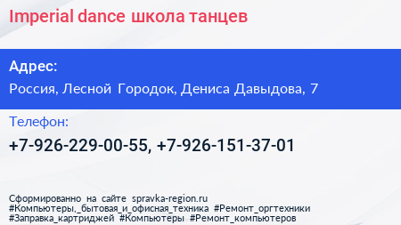 Imperial dance, школа танцев по адресу Гусарская баллада, 7, улица Дениса Давыдова, Жилой комплекс «Гусарская баллада», ВНИИССОК, Одинцовский городской округ, Московская область, Центральный федеральный округ, 143002, Россия в дальнейшем Организация, размещена в следующих категориях:
